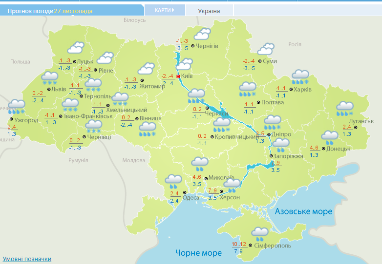 В Украине в ближайшие сутки, 27 ноября, ненастную погоду будет определять балканский циклон, перемещающийся через юг Украины в восточном направлении, сообщает Укргидрометцентр.
