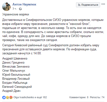 28 ноября Киевский районный суд Симферополя в аннексированном Крыму должен избрать меру пресечения в отношении еще 9 захваченных 25 ноября украинских моряков. Об этом на своей странице в Facebook написал журналист Антон Наумлюк.