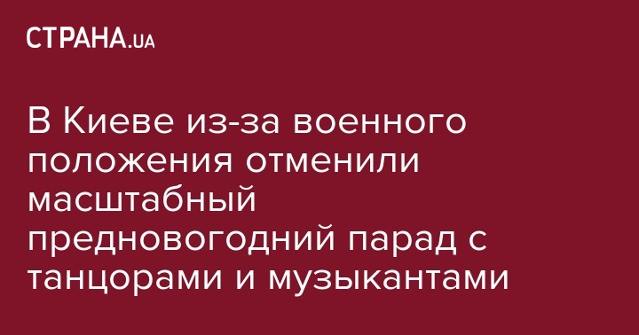 В связи с введением военного положения 23 декабря в Киеве отменили новогодний парад с участием более тысячи танцоров, акробатов, музыкантов, представителей организаций и сообществ, участников молодежных субкультур. Об этом сообщили организаторы марша.