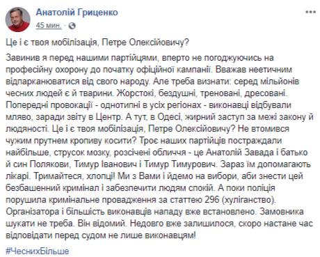 "Приношу извинения нашими партийцами, что упорно не соглашался на профессиональную охрану до начала официальной кампании. Считал неэтичным отделятся от своего народа. Но надо признать: среди миллионов честных людей есть и животные. Жестокие, бездушные, тренированные, дрессированные. Предыдущие провокации - однотипные во всех регионах - исполнители отбывали вяло, ради отчета в Центр. А здесь, в Одессе, жирный заступ за пределы закона и человечности. Это и есть твоя мобилизация, Петр Алексеевич?", - написал он в Facebook.