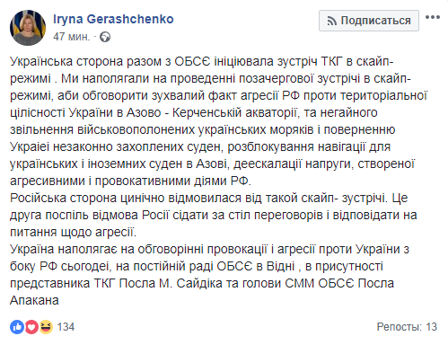 Украина потребовала созвать внеочередную скайп-встречу Трехсторонней контактной группы, чтобы обсудить Азовский кризис и российскую агрессию в Керченском проливе, однако Российская Федерация отказалась участвовать в ней. Об этом первый вице-спикер Рады, представитель Украины на переговорах Ирина Геращенко написала на своей странице в Facebook.
