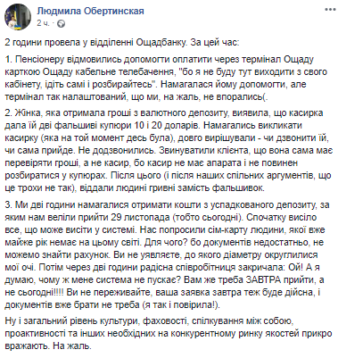 "Женщина, которая получила деньги с валютного депозита, обнаружила, что кассирша дала ей две фальшивые купюры 10 и 20 долларов. Пытались вызвать кассиршу (которая на тот момент где-то была), долго решали - звонить ли ей, или сама придет. Не дозвонились. Обвинили клиента, она сама должна проверять деньги, а не кассир, потому что кассир не имеет аппарата и не должен разбираться в купюрах. После этого (и после общих аргументов, что это немного не так), отдали человеку гривны вместо фальшивок", - поделилась впечатлениями в соцсети Людмила Обертинская.