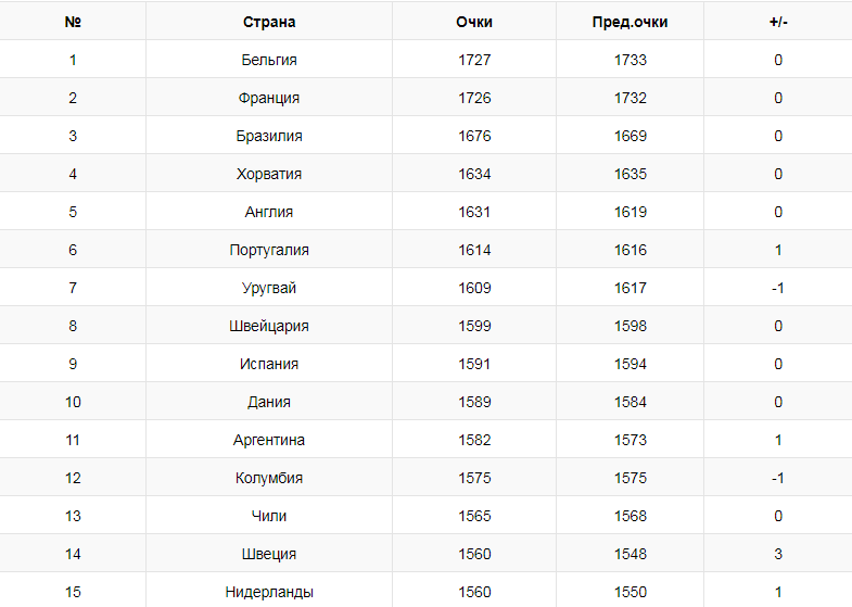 Среди десятки лучших сборных мира одно изменение - Португалия (6) поменялась местами с Уругваем (7). Команда Швеции поднялась с 17-го на 14-е место. Также отмечаются "прыжки" чехов и сербов на 6 мест вверх.