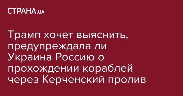 Президент США Дональд Трамп намерен выяснить, предупреждала ли Украина Россию о том, что ее корабли "Бердянск", "Никополь" и "Яны Капу" хотят проследовать из Одессы (Черное море) в Мариуполь (Азовское море) через Керченский пролив 25 ноября. Такое заявление американский президент сказал в интервью New York Post в Овальном кабинете Белого дома. Трамп предположил, что между украинскими и российскими военными должна быть выработана специальная система для подобных ситуаций.