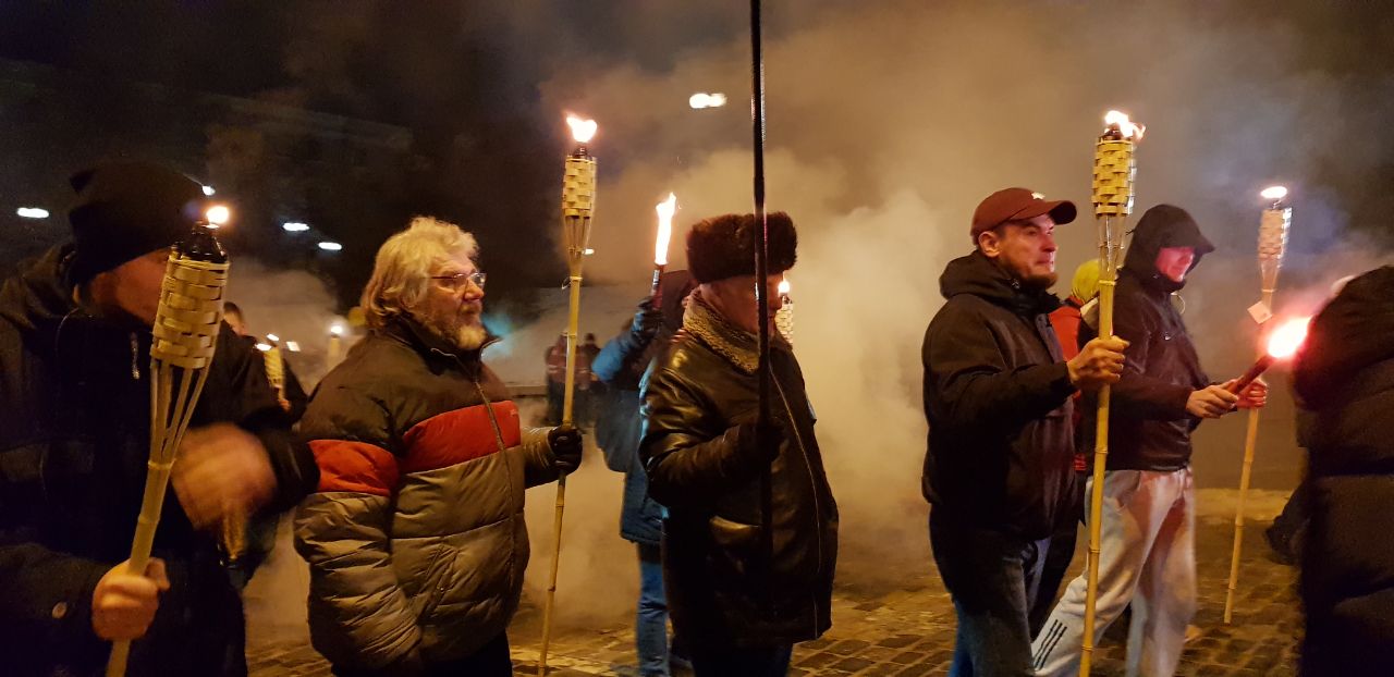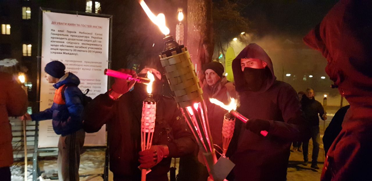 В центре Киева проходит факельное шествие по случаю годовщины разгона Майдана в 2013 году.  Участники акции пришли к Министерству внутренних дел Украины с требованием конкретных результатов расследования преступлений, совершенных во время Евромайдана и Революции Достоинства. Об этом сообщает "Интерфакс-Украина".