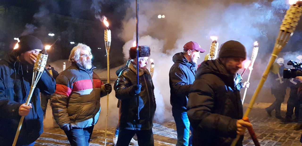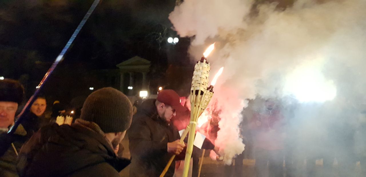 Участники акции держат в руках факелы и периодически зажигают файеры и выкрикивают патриотические лозунги.