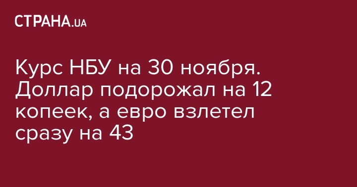 Также НБУ повысил и курс евро, причем сразу на 43 копейки до 32,33 гривен за евро. Официальный курс евро на 30 ноября установлен на уровне 3232,8754 гривни за 100 евро (+42,9959 грн). Подорожание евро вызвано ростом курс единой европейской валюты к доллару на международном рынке.