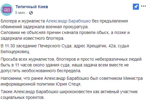 Суд состоится в 11.30, заседание будет вести судья Олег Белоцерковец, пишет группа "Типичный Киев" в Facebook. "Блогера и журналиста Александр Барабошко без предъявления обвинений задержала военная прокуратура. Силовики не объясняя причин сначала провели обыск, а позже и задержали известного блогера. В 11.30 заседание Печерского суда, адрес Хрещатик, 42а, судья Белоцерковец", - говорится в сообщении.