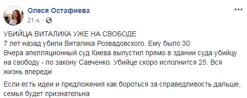 "7 лет назад убили Виталика Розвадовского. Ему было 30 лет. Вчера апелляционный суд Киева выпустил прямо в здании суда убийцу на свободу - по закону Савченко", - написала она.