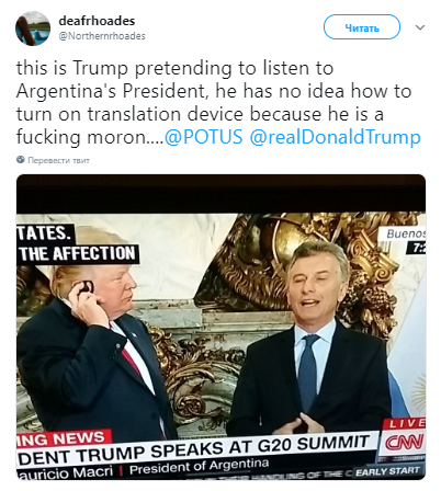 Президент США Дональд Трамп разочаровался в синхронном переводе во время приветственной речи аргентинского коллеги Маурисио Макри и бросил приемник, из которого звучал перевод на пол. Видео из президентской резиденции в Буэнос-Айресе опубликовано в Facebook на странице Rioja Noticias.