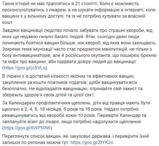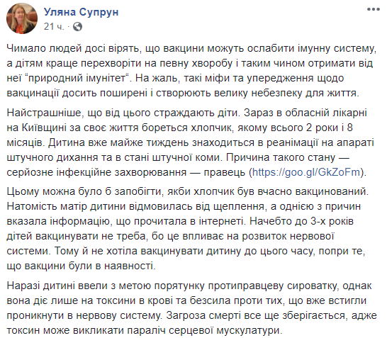 Супрун отметила, что таких историй не должно случаться в 21 веке. Когда есть возможность проконсультироваться с врачом, а не искать информацию в интернете, когда вакцины есть в свободном доступе, и их не нужно покупать за свой счет.