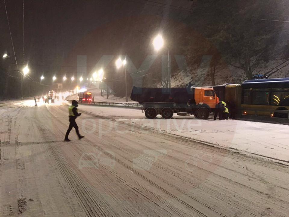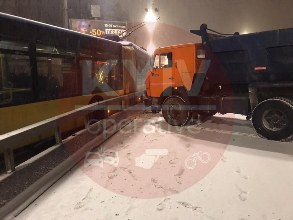 Фура врезалась в отбойник и задела троллейбус на улице Телиги в Киеве. Фото и видео