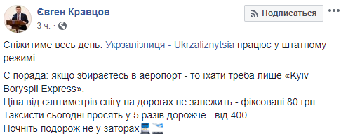 "Есть совет: если собираетесь в аэропорт - то ехать надо только Kyiv Boryspil Express. Цена от сантиметров снега на дорогах не зависит - фиксированные 80 грн. Таксисты сегодня просят в 5 раз дороже - от 400. Начните путешествие не в пробках", - писал он.