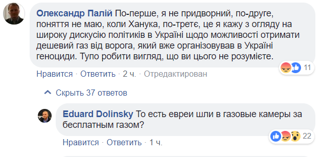"Во-первых, я не придворный, во-вторых, понятия не имею, когда Ханука, в-третьих, это я говорю учитывая широкую дискуссию политиков в Украине о возможности получить дешевый газ от врага, который уже организовывал в Украине геноцид. Тупо делать вид, что вы этого не понимаете".