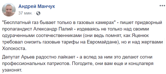 "Бесплатный газ бывает только в газовых камерах" - пишет придворный пропагандист Александр Палий - издеваясь не только над своими одураченными соотечественниками (они ведь помнят, как Яценюк требовал снизить газовые тарифы на Евромайдане), но и над жертвами Холокоста.