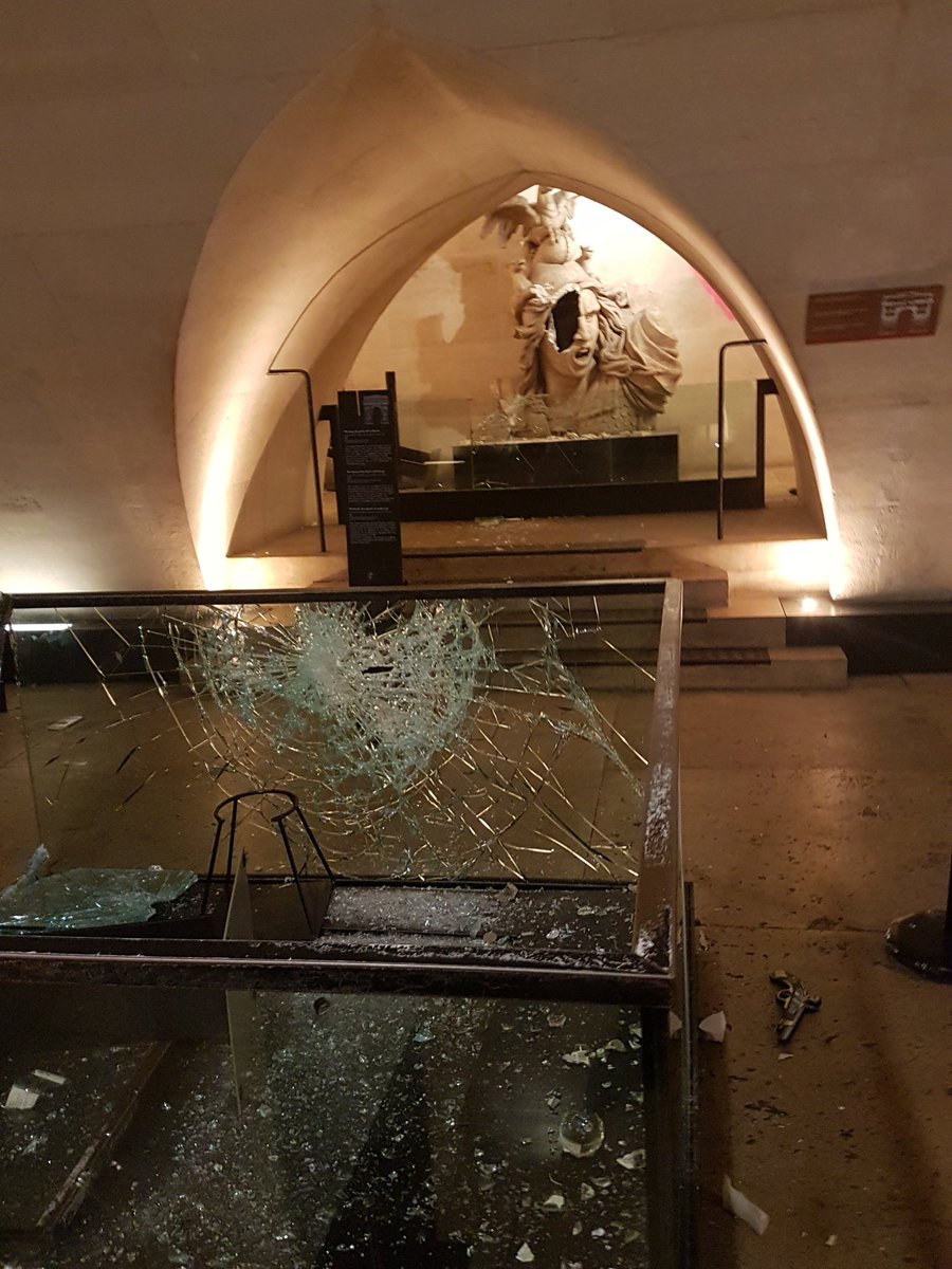 Протестующие исписали стены монумента разнообразными надписями вроде "Макрона в отставку", "Желтые жилеты празднуют триумф". Некоторые протестующие забирались наверх Триумфальной арки, повреждая при этом декоративную отделку монумента. Были повреждены также статуи, которые украшают арку.