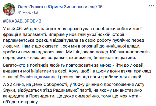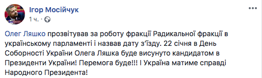 "22 января, в 100-ю годовщину провозглашения Акта воссоединения, состоится съезд Радикальной партии, на котором мы выдвинем кандидата в президенты. Это очень символично, потому что моя мечта – объединить Украину", - сказано в сообщении на его странице в Facebook.
