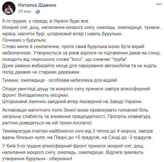 В среду, 5 декабря, в Украине ожидается мокрый снег, дождь, налипание мокрого снега, гололед, гололедица, туман, морось, магнитные бури, штормовой ветер и даже сосульки. Об этом сообщает синоптик Наталья Диденко на своей странице в Facebook.