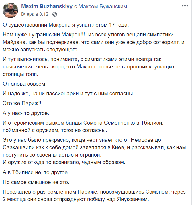Это у нас было прекрасно, когда черт знает кто от Немцова до Саакашвили как к себе домой заявлялся в Киев, и рассказывал, как нам поступить со своей властью и страной. И оружие откуда то возникало, чудным образом. А в Тбилиси не, то другое.