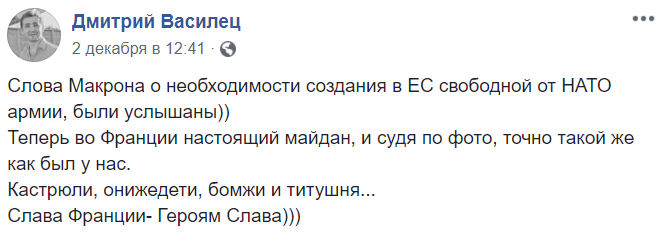 "Слова Макрона о необходимости создания в ЕС свободной от НАТО армии, были услышаны. Теперь во Франции настоящий майдан, и судя по фото, точно такой же как был у нас.