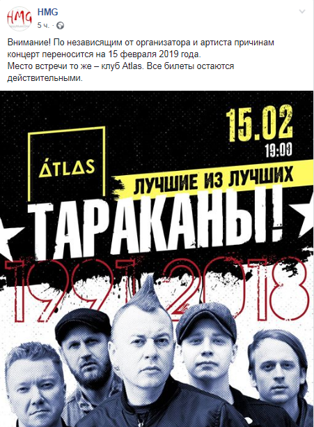 В частности, речь о концерте панк-группы "Тараканы", который должен был состояться 8 декабря в столичном клубе Atlas. Его перенесли на 15 февраля 2019 года. "По независящим от организатора и артиста причинам концерт переносится на 15 февраля 2019 года. Место встречи то же – клуб Atlas. Все билеты остаются действительными", - сказано в сообщении на Facebook-странице мероприятия. Сами музыканты объяснили смену даты киевского концерта введением военного положения в Украине.