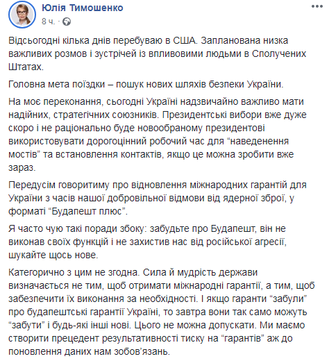 "С сегодняшнего дня несколько дней нахожусь в США. Запланирован ряд важных разговоров и встреч с влиятельными людьми в Соединенных Штатах. Главная цель поездки – поиск новых путей безопасности Украины", - указано в начале опубликованного сообщения.