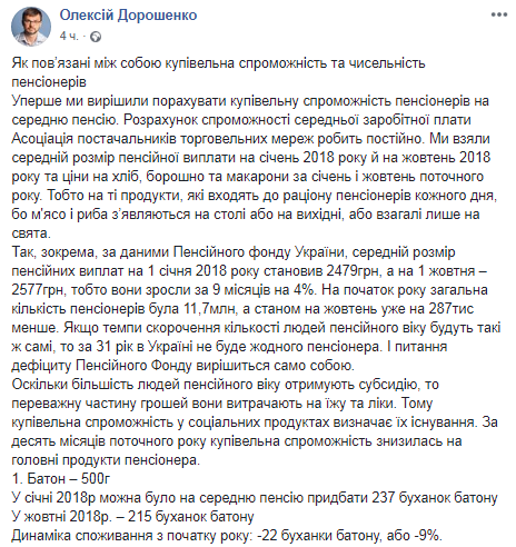 За январь - октябрь 2018 года в Украине снизилась покупательная способность пенсионеров. Об этом на своей странице в Facebook сообщил директор Ассоциации поставщиков торговых сетей Алексей Дорошенко.