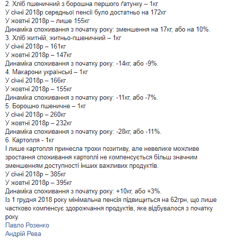 Далее Дорошенко приводит цены на продукты, которые составляют основной рацион пенсионера. Так, в январе 2018 можно было на среднюю пенсию приобрести 237 буханок батона, а октябре 2018 - 215 буханок. Динамика потребления демонстрирует уменьшение на 22 буханки батона, или 9%. В январе 2018 средней пенсии было достаточно на 172 кг пшеничного хлеба, в октябре 2018 - только 155 кг. Динамика потребления с начала года: уменьшение на 17 кг, или на 10%. В январе 2018 пенсионер мог позволить себе в среднем 166 кг отечественных макарон, в октябре 2018 - 155 кг. Динамика потребления с начала года: -11 кг, или -7%. Эксперт резюмирует, что динамика уменьшилась и в случае с мукой. Повысилась она лишь относительно картофеля.