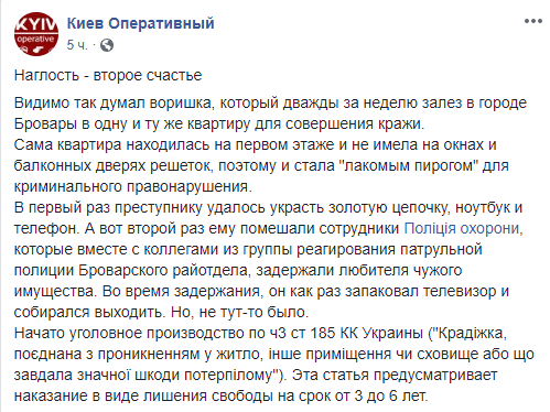 "В первый раз преступнику удалось украсть золотую цепочку, ноутбук и телефон. А вот второй раз ему помешали сотрудники полиции охраны, которые вместе с коллегами из группы реагирования патрульной полиции Броварского райотдела, задержали любителя чужого имущества. Во время задержания, он как раз запаковал телевизор и собирался выходить," - говорится в сообщении.