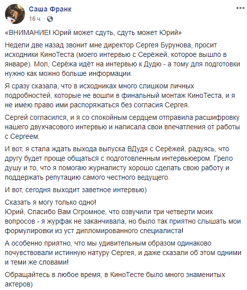 Франк сообщила, что директор Бурунова попросил у нее исходники интервью для подготовки Дудя к беседе. Она отправила их, уточнив, что там есть много подробностей из личной жизни актера, которые не вошли в финальный монтаж.