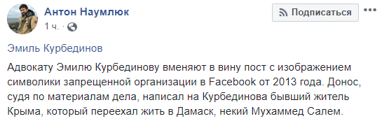 "Адвоката Эмиля Курбединова обвинили за пост с изображением символики запрещенной организации в Facebook от 2013 года", - написал он. Наумлюк добавил, что донос, судя по материалам дела, написал на Курбединова бывший житель Крыма, который переехал жить в Дамаск, некто Мухаммед Салем.