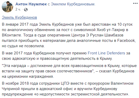 Он отметил, что в мае 2017 года Курбединов получил премию Front Line Defenders за свою адвокатскую и правозащитную деятельность в Крыму. А в ноябре 2018 сотрудники "Центра противодействия экстремизму" вместе с прокурором Валентином Чуприной пришли в адвокатский офис и вручили Курбединову предупреждение "о недопустимости экстремистской деятельности".