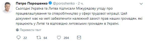 "По результатам сегодняшних переговоров с президентом Литвы Далей Грибаускайте был подписан ряд важных двусторонних документов, среди которых Дорожная карта развития стратегического партнерства между Украиной и Литовской Республикой на 2019-2020 годы", - отметил Порошенко на своей странице в Twitter.