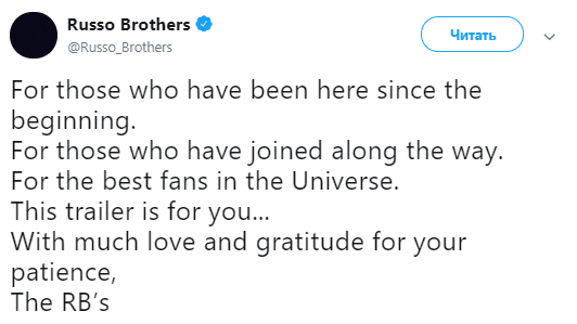 "Для тех, кто был с нами с самого начала. Для тех, кто присоединился в пути. Для лучших фанатов во Вселенной. Этот трейлер для вас. С большой любовью и благодарностью за терпение", - написали режиссеры картины Энтони и Джо Руссо в своем аккаунте в Twitter.