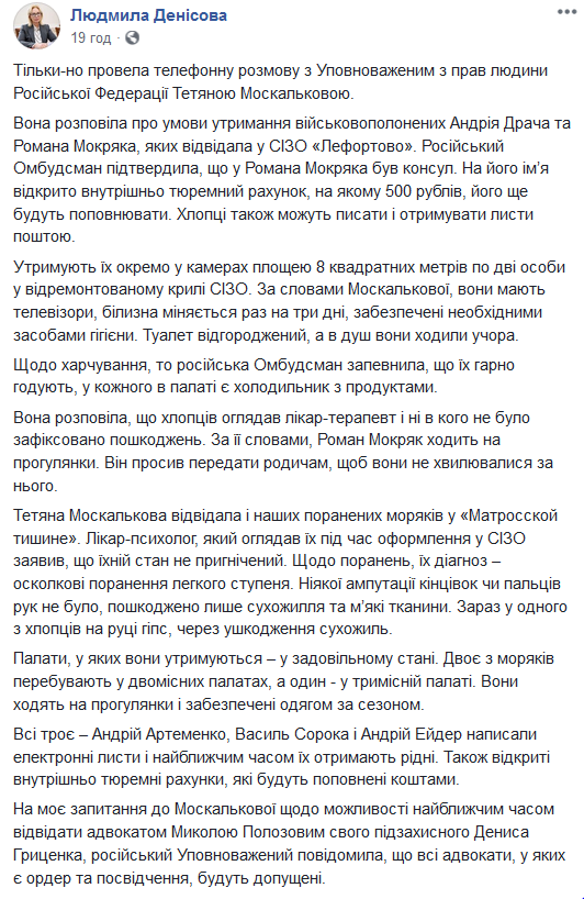 Украинский омбудсмен Людмила Денисова провел телефонный разговор со своей российской коллегой Татьяной Москальковой и выяснила в каких условиях содержатся захваченные украинские моряки в двух СИЗО Москвы.