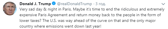 "Может быть, пришло время покончить с нелепым и чрезвычайно дорогим Парижским соглашением и вернуть деньги людям в виде более низких налогов?" - заявил Трамп.