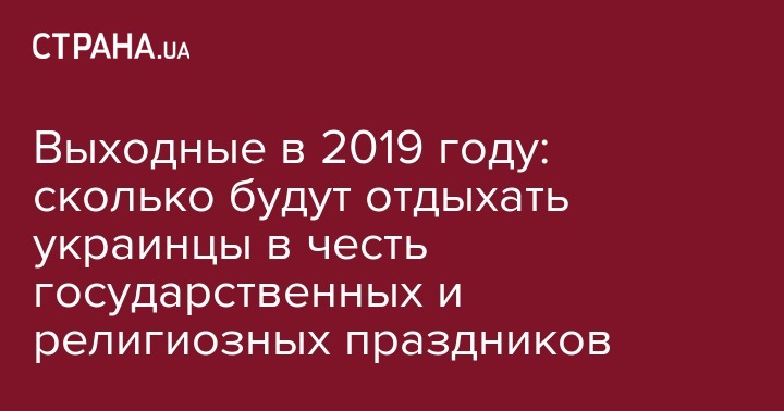 В 2019 году в Украине утверждено 11 дополнительных выходных дней в честь государственных и религиозных праздников. Их назначение регулирует закон Украины "О труде".