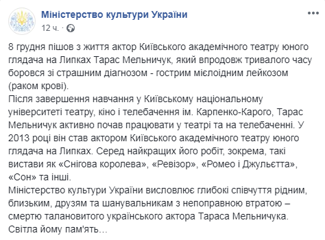 В субботу, 8 декабря, скончался молодой актер Киевского академического театра юного зрителя на Липках Тарас Мельничук. Об этом сообщает Министерство культуры Украины на своей странице в Facebook.