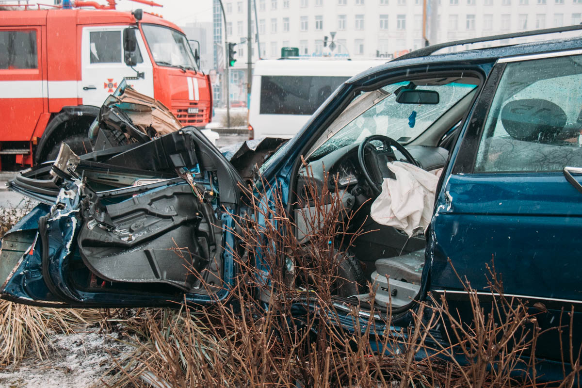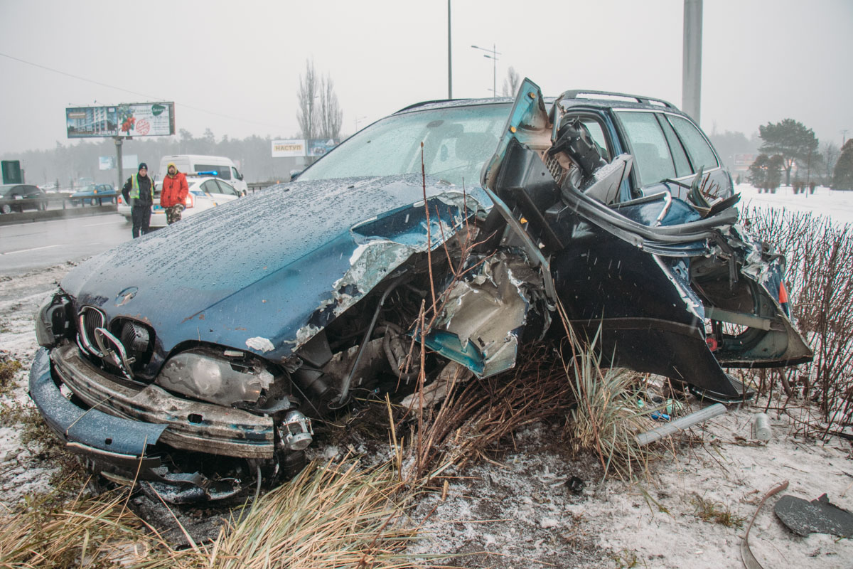Автомобиль BMW ехал в крайней правой полосе по проспекту Бажана в сторону "круга", в это время его подрезала "Газель". Водитель иномарки попытался резко свернуть, однако автомобиль занесло и выбросило на обочину в центре развязки. BMW получил серьезные повреждения. Переднее левое колесо практически полностью оказалось в салоне машины и прижало ногу водителя. 25-летнего парня спасателям удалось освободить только при помощи специнструментов.