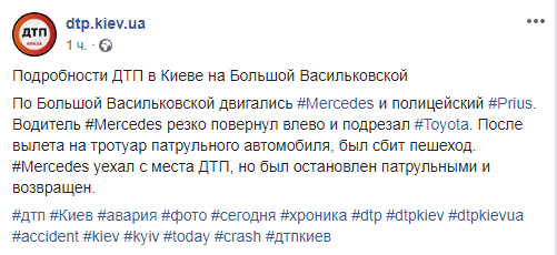 Уже утром на Большой Васильковской произошла третья авария с участием полицейского авто. Mercedes, который двигался по улице, свернул налево из правого ряда, в результате чего подрезал авто патрульной полиции. Водитель выкрутил руль и вылетел в ограждение кафе, сбив пешехода. У пострадавшего травма ноги. Mercedes уехал с места, но патрульные догнали его и вернули на место ДТП.