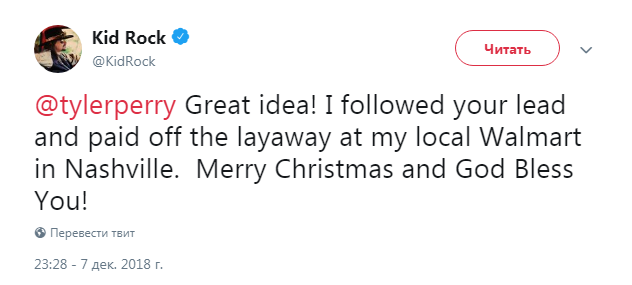 В своем Twitter Кид Рок отметил, что идея принадлежит комику Тайлеру Перри, который таким способом оплатил товары покупателей двух магазинов Walmart в штате Джорджия на сумму 434 тысячи долларов.