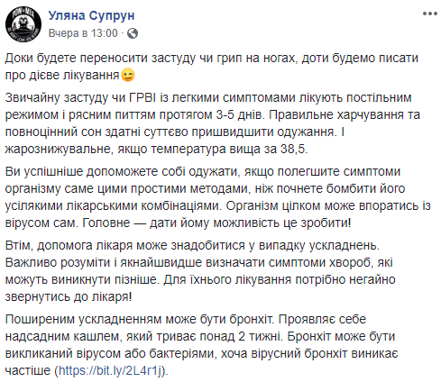 "Вы успешно поможете себе выздороветь, если облегчите симптомы организма именно этими простыми методами, чем начнете бомбить его всевозможными лекарственными комбинациями. Организм вполне может справиться с вирусом сам. Главное - дать ему возможность это сделать! Впрочем, помощь врача может понадобиться в случае осложнений. Важно понимать и как можно быстрее определять симптомы болезней, которые могут возникнуть позже. Для их лечения нужно немедленно обратиться к врачу!" - рассказала Супрун.