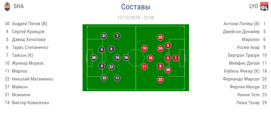 Лион: Лопеш - защита Тете, Денайер, Марсело, Марсал, Менди - полузащитник Тусар, Ауар, Фекир - нападающий Траоре, Депай.