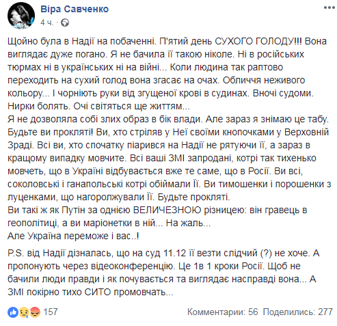 "Только что была у Надежды на свидании. Пятый день сухого голода! Она выглядит очень плохо. Я не видела ее такой никогда", - говорится на странице Веры Савченко в Фейсбуке 10 декабря.