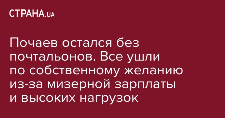 В городе Почаев, что в Тернопольской области, произошло неординарное событие. Здесь все почтальоны уволились по собственному желанию. Люди недовольны тем, что их мизерная зарплата может еще уменьшиться, в то время как нагрузки выросли, передает ТСН.