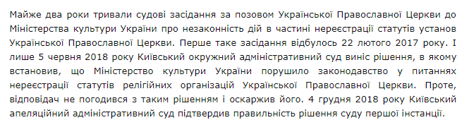 "Только 5 июня 2018 года Киевский окружной административный суд вынес решение, в котором установил, что Министерство культуры Украины нарушило законодательство в вопросах нерегистрации уставов религиозных организаций Украинской Православной Церкви", – говорится в докладе Управляющего делами УПЦ митрополита Бориспольского и Броварского Антония за 2018 год.