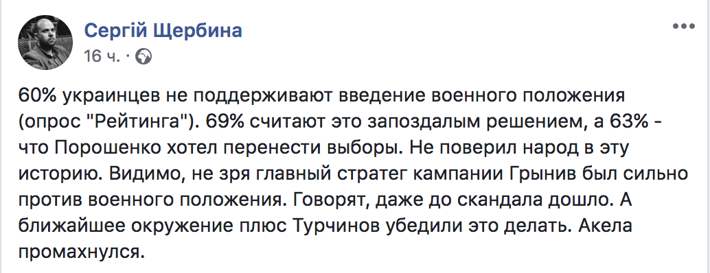 "60% украинцев не поддерживают введение военного положения (опрос "Рейтинга"). 69% считают это запоздалым решением, а 63% - что Порошенко хотел перенести выборы. Не поверил народ в эту историю. Видимо, не зря главный стратег кампании Грынив был сильно против военного положения. Говорят, даже до скандала дошло. А ближайшее окружение плюс Турчинов убедили это делать. Акела промахнулся", - пишет на своей страницы в ФБ известный журналист Сергей Щербина.