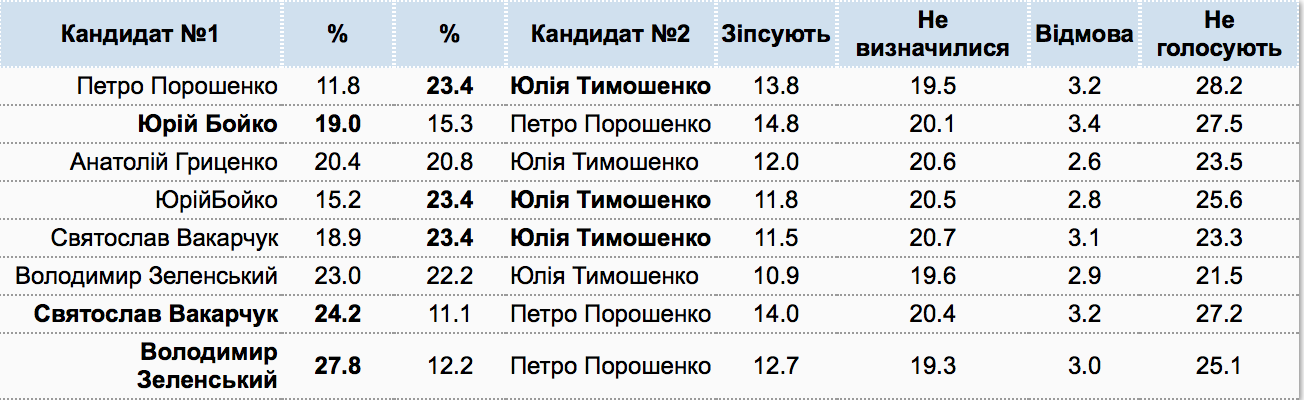 Во-вторых, по данным опроса, если Порошенко все-таки каким-то образом и проберется во второй тур, то он проиграет всем возможным кандидатам - Бойко, Вакарчуку, Зеленскому и Тимошенко.