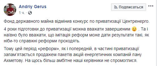 Фонд госимущества отменил конкурс по приватизации компании "Центрэнерго", который должен был состояться 13 декабря. Об этом на своей странице в Facebook написал эксперт по вопросам энергетики Андрей Герус.