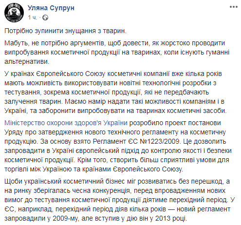 По мнению Супрун, внедрение запрета на испытания косметики на животных не создаст препятствий для честной конкуренции в Украине.